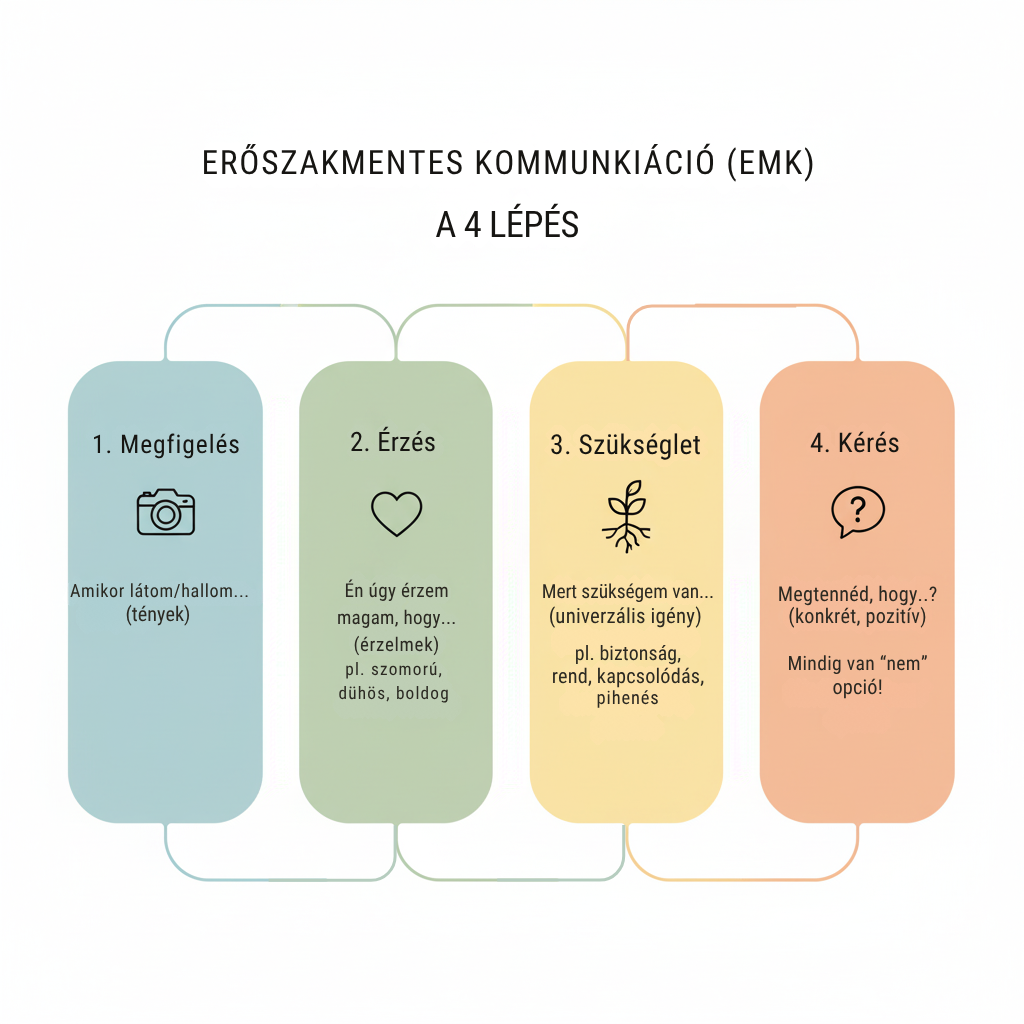 A módszer 4 lépése:Megfigyelés, Érzés, Szükséglet, Kérés