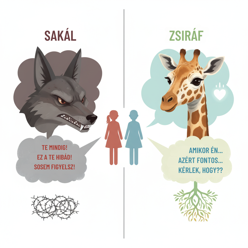 Zsiráf (Megfigyelés): „Látom a sáros cipődet az előszoba közepén.” Az értékelés ellenállást szül, tényekkel azonban nem lehet vitatkozni.